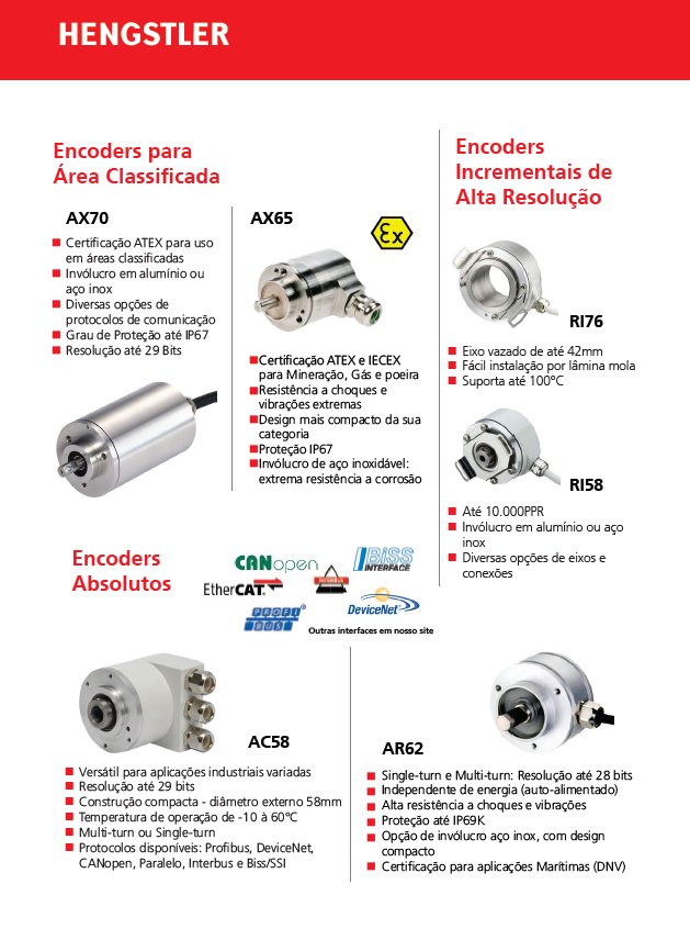 A Hengstler apresenta um portfólio completo de encoders incrementais e absolutos single-turn ou multi-turn. Dependendo dos níveis de desempenho e tipos de aplicações, várias opções estão disponíveis: