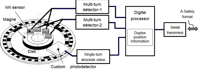Os encoders absolutos possuem uma indexação específica para cada posição ao longo de uma rotação. Encoders absolutos multi-turn conseguem registrar além da posição em uma rotação de 360º o número da volta que está realizando a contagem. Portanto, não há necessidade de retorno ao local e as informações não são perdidas quando o dispositivo é desligado. No momento em que um codificador de ângulo absoluto é ativado, a partir da sequência de informação de sua saídaele relata com precisão a localização na qual ele se encontra.