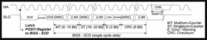 - Os codificadores BiSS também podem transportar outros dados digitais (temperatura, etc.) e transmitir os dados ao mestre sob demanda, sem interferir na operação em tempo real.