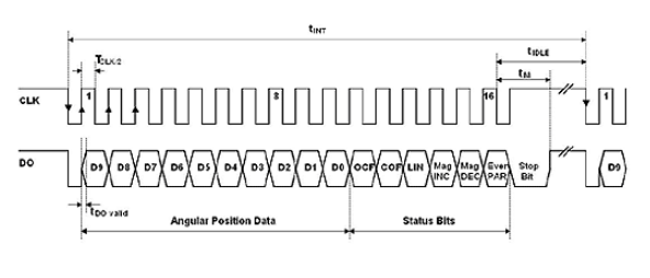 O clock permanece alto até que o mestre precise de informações do sensor. Em seguida, ele envia um fluxo de pulsos de clock equivalente ao número de bits de informação do codificador. Amostras de cada bit são geralmente coletadas na borda decrescente do pulso do clock. Isso garante que os atrasos de propagação e processo sejam contabilizados.