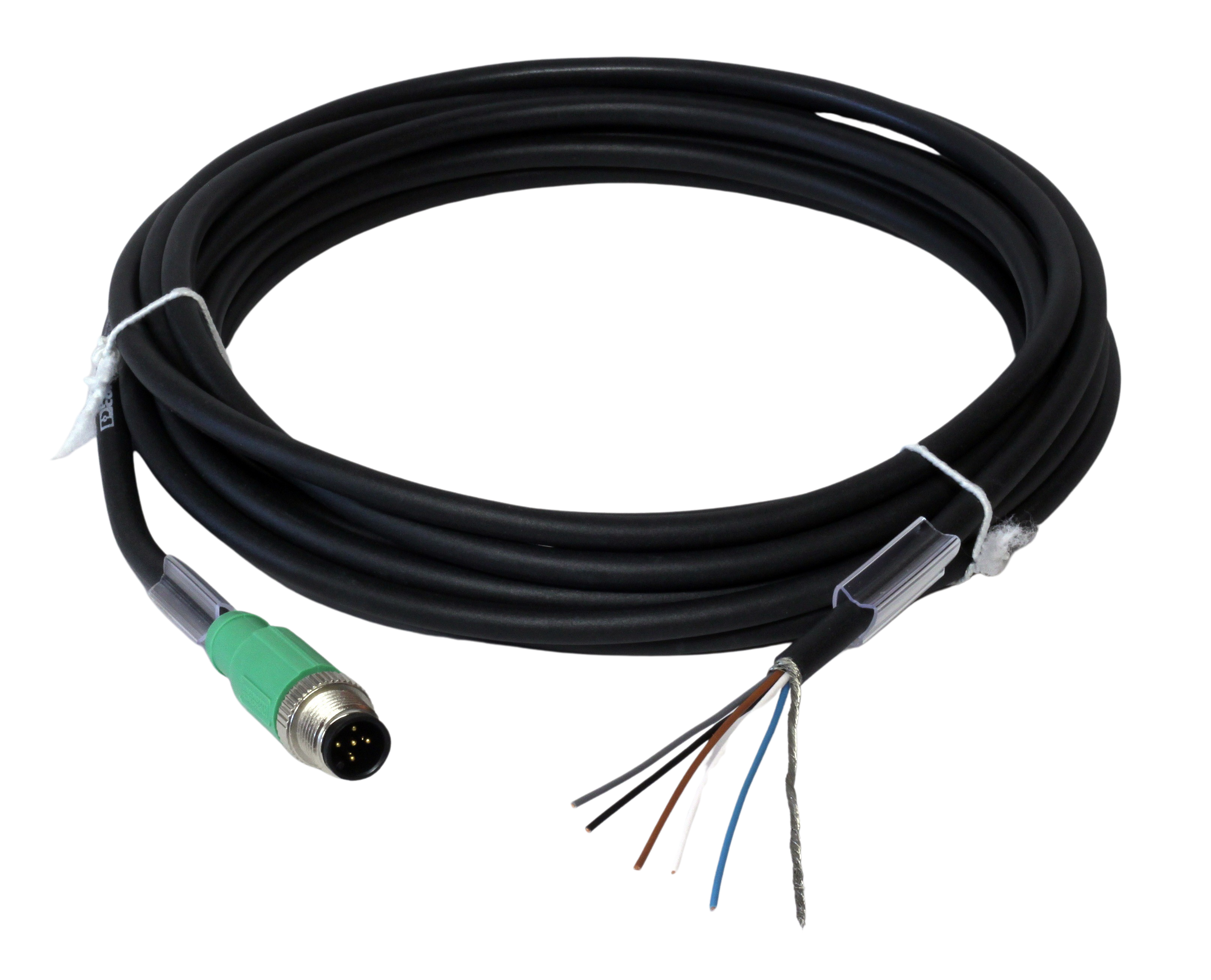 - Conectores: Possui conectores M12 em uma extremidade e fios desencapados na outra, permitindo uma fácil integração em diferentes tipos de instalações.