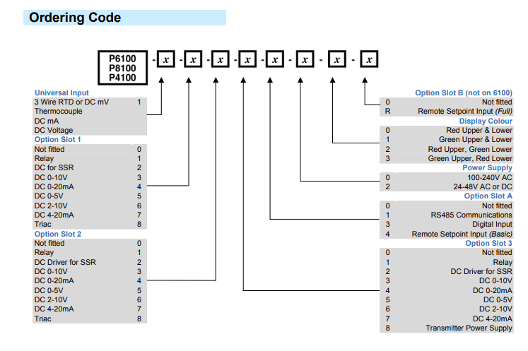 Com a tabela de códigos acima como apoio a linha de controladores de processos e temperatura P8100+ da WEST oferece uma variedade de modelos, para definir um modelo adequado basta especificar: o tipo de entrada, necessidade de saídas adicionais – slots de expansão 1,2 e 3, necessidade de saídas específicas – slot de expansão A, alimentação, e como opcional a cor dos LEDs do display.