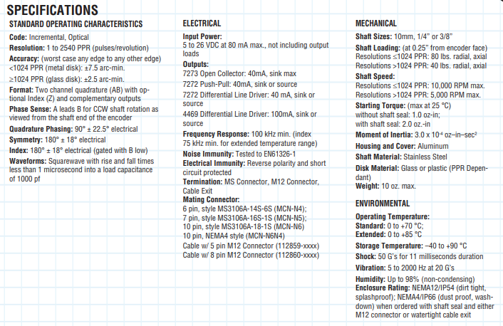 Para especificar um encoder devemos saber se ele será incremental ou absoluto, quantos PPR (Pulsos Por Rotação) ele terá, se o eixo será sólido, vazado, expandido ou passante, qual é o diâmetro e o comprimento desse eixo, qual é a tensão de alimentação e qual o tipo de cabo ou conector.