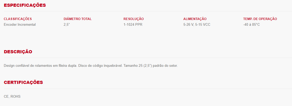 Possui resolução de 1024PPR. A temperatura de operação é de -40°-85°C. É um encoder leve, com aproximadamente 700 gramas. Tem o grau de proteção IP66. Consulte os detalhes.