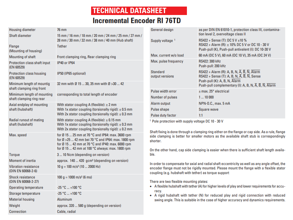 Encoder RI76TD8192AD4N15TF, Principais Aplicações: Atuadores, Motores – Automação de Fábricas – Elevadores – Embalagem – Laboratórios – Motores Elétricos – Papel e Celulose – Servomotores – Siderurgia e Mineração.