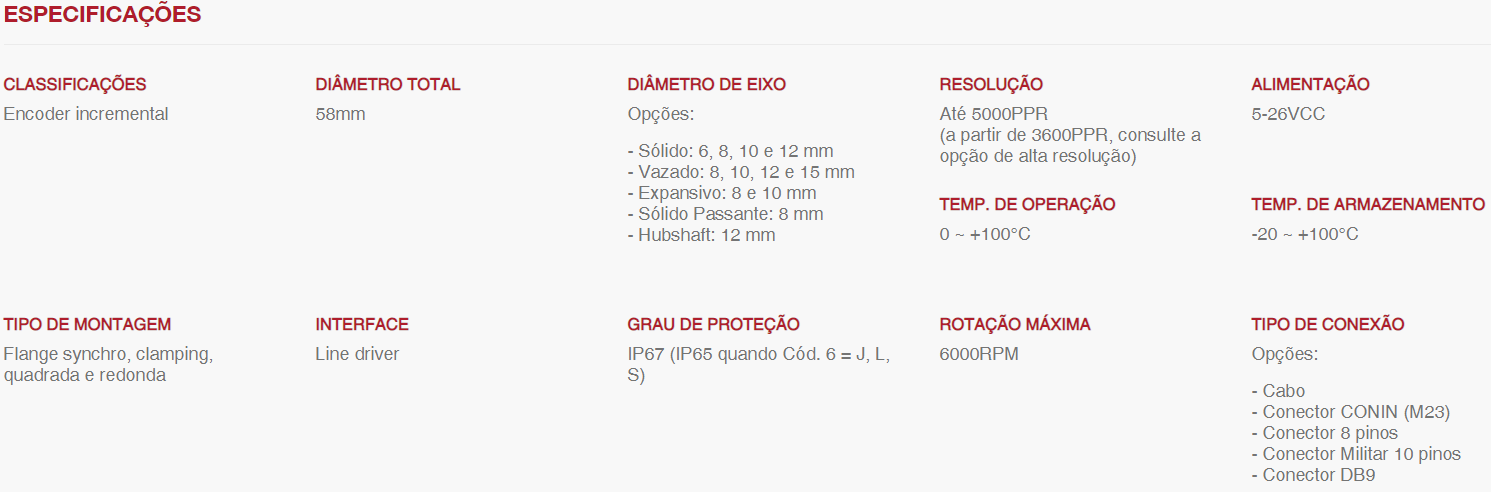Para especificar um encoder devemos saber se ele será incremental ou absoluto, quantos PPR (Pulsos Por Rotação) ele terá, se o eixo será sólido, vazado, expandido ou passante, qual é o diâmetro e o comprimento desse eixo, qual é a tensão de alimentação e qual o tipo de cabo ou conector.