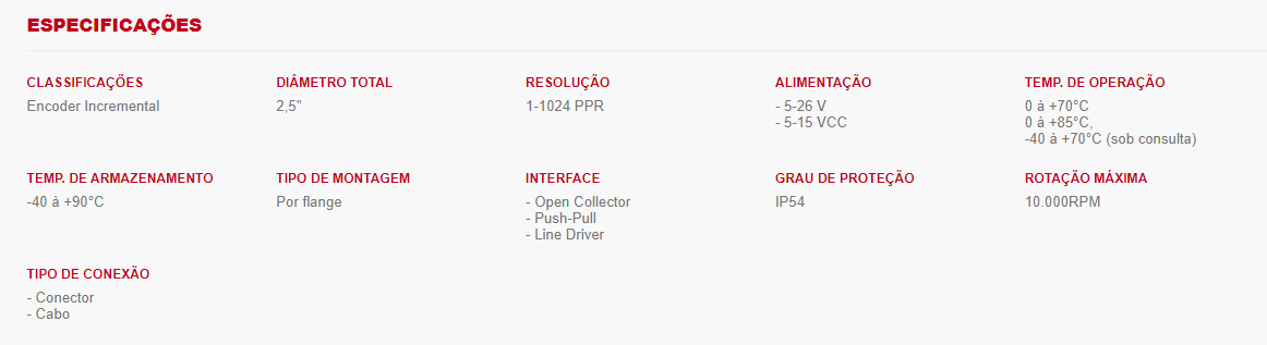 Possui resolução de 1024PPR. A temperatura de operação é de 0°-85°C e a de armazenamento de -40°C a 90°C. É um encoder leve, com aproximadamente 700 gramas. Tem o grau de proteção IP54. Consulte os detalhes.