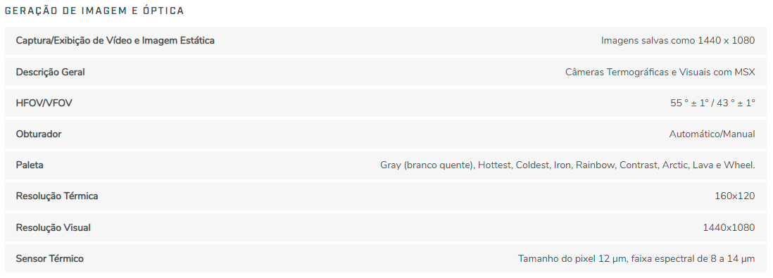 ±3 °C ou ±5%, típico Porcentagem da diferença entre a temperatura ambiente e a de cena. Aplicável 60s após a inicialização, quando a unidade está entre 15 °C e 35 °C e a cena está entre 5 °C e 120 °C.