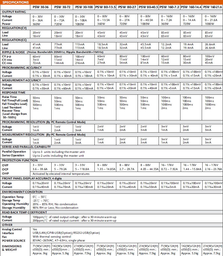 Um equipamento da série-PSW pode estar conectado com no máximo 2 unidades da serie PSW ou sé estiver em paralelo em até 3. Sua capacidade de estar conectado com multiplas unidades das PSW para uma saída com maior corrente ou maior voltagem permite uma vasta gama de aplicações. Com a flexibilidade dos múltiplos alcances utilizáveis e conexão em série ou paralelo, a série PSW reduz os custos dos usuários para vários produtos de fonte de alimentação, acomodando os diferentes requisitos de energia de seus projetos.