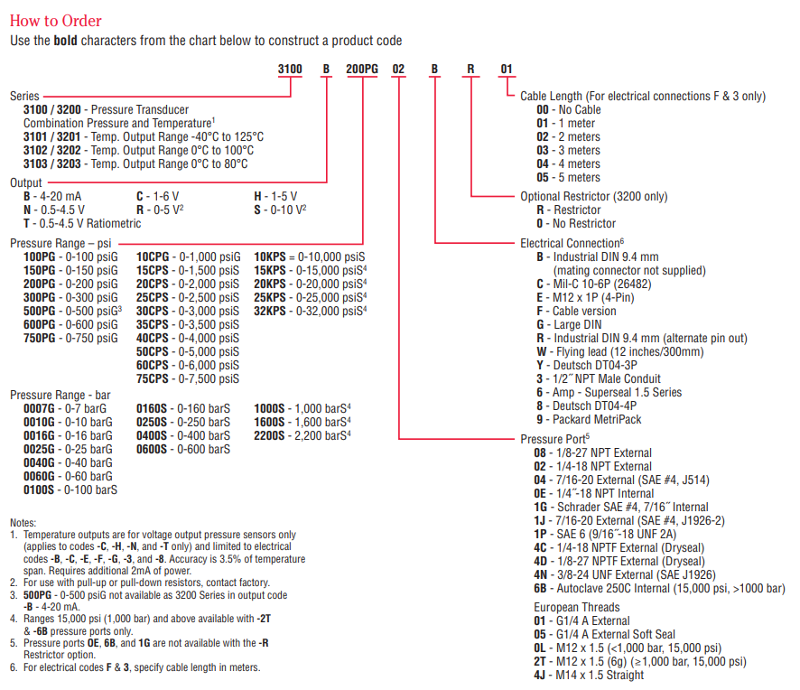 Com a tabela de códigos acima como apoio a linha de transdutores de pressão Gems oferece uma variedade de modelos, para definir um modelo adequado basta especificar: a série de transdutores desejada; a saída; o range de pressão desejado – psi ou bar; a porta de pressão; o tipo de conexão elétrica; caso seja um 3200 pode se escolher um restritor; e por o tamanho do cabo.