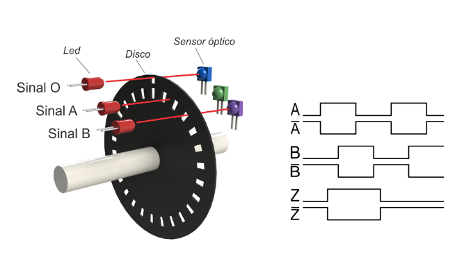 O tipo mais comum de encoders Rotativos ópticos apresenta 3 canais de saída, canal A, canal B e canal Z.